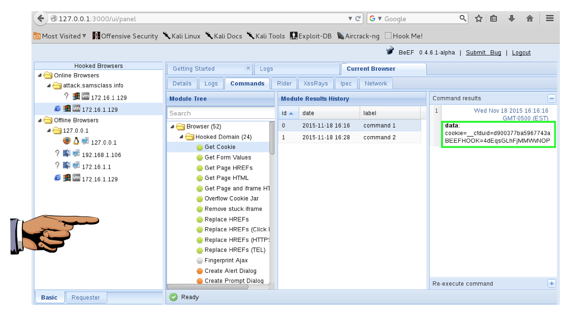 On Kali, in IceWeasel, In the "Module Results History" pane, click the "command 1" line.