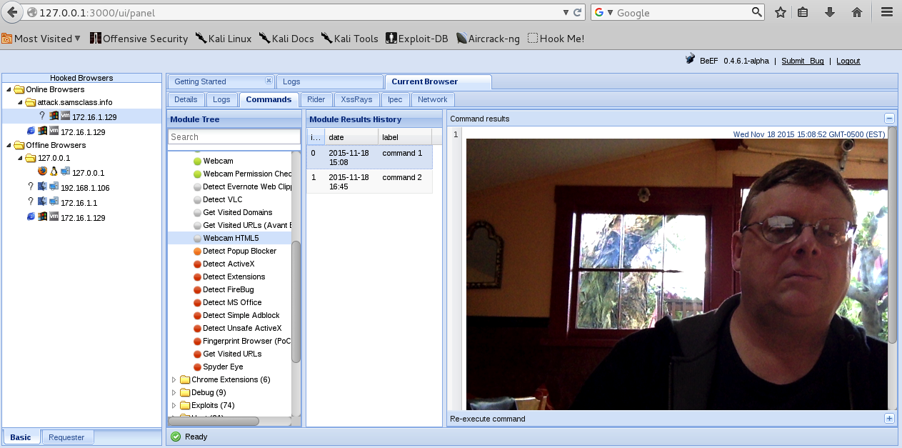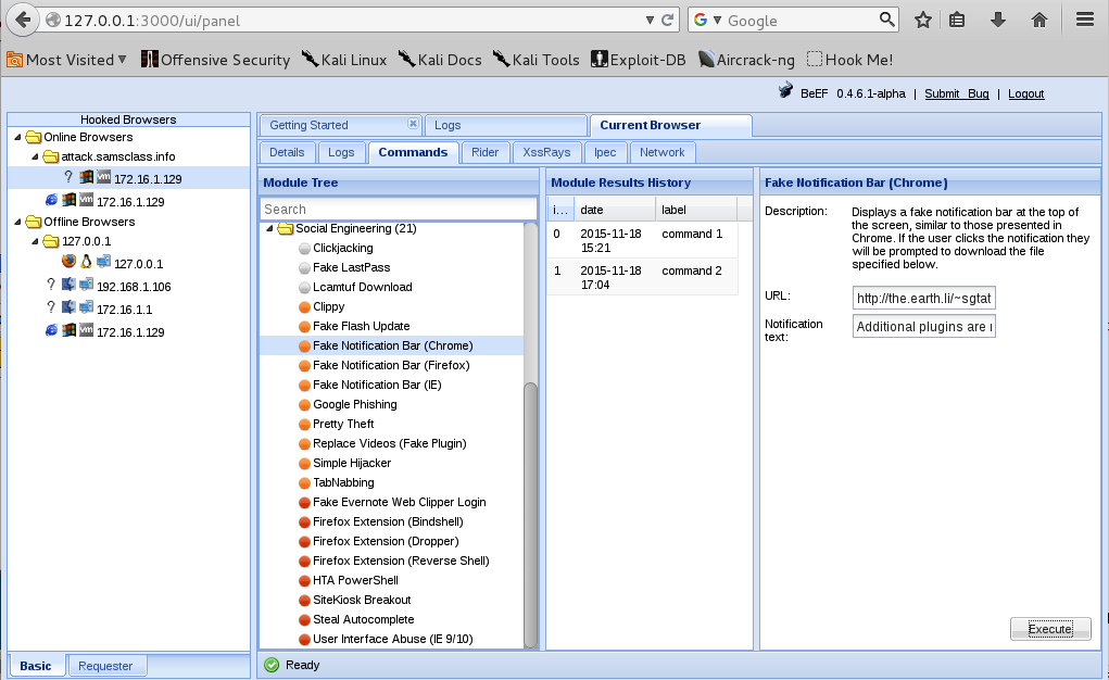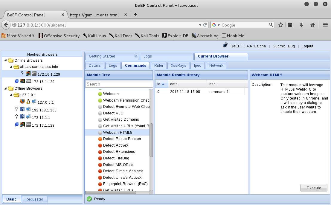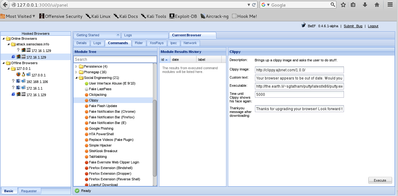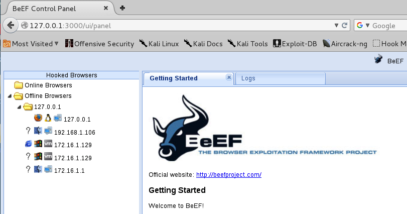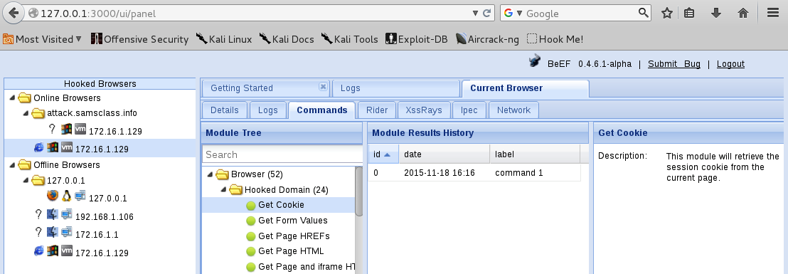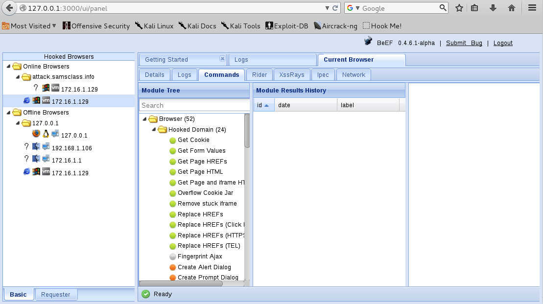 (My BeEF shows some offline browsers from earlier runs; yours probably will not.)