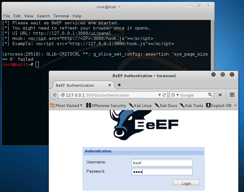 In Kali, in IceWeasel, click the "BeEF Control Panel" tab.