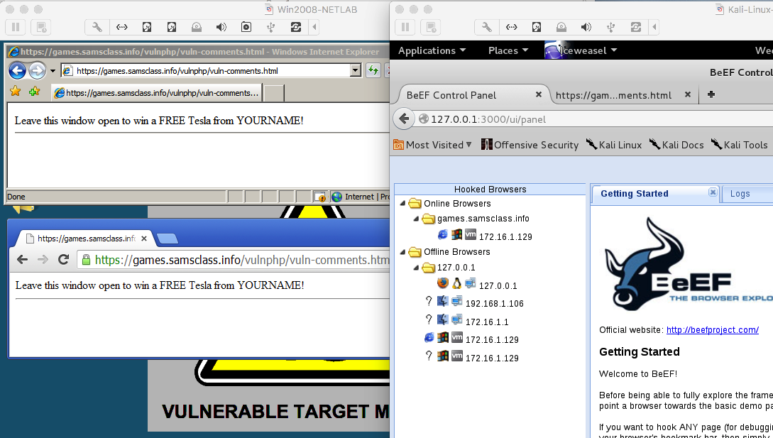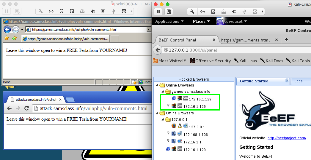 On your Kali machine, in IceWeasel, on the "BeEF Control Panel" tab, you see only "Online Browser" with an Internet Explorer icon, as shown below. Chrome isn't falling for this trick.