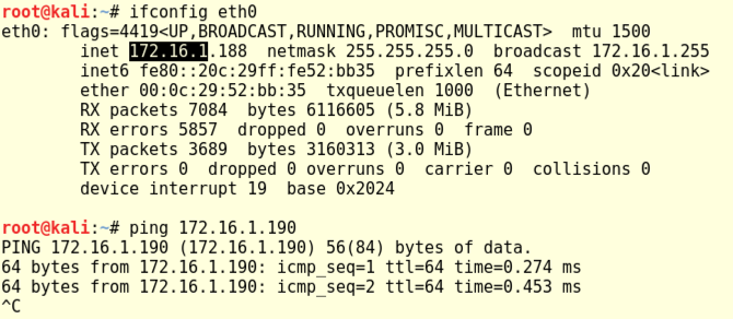 Execute the ifconfig command on both machines and ping from one to the other. Make sure you get replies, as shown below.