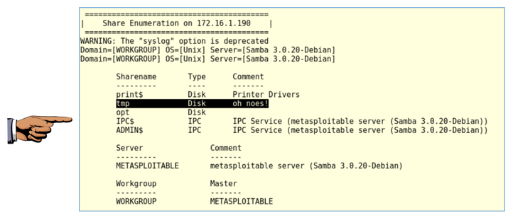 Then a "Share Enumeration" appears, showing that the /tmp folder is shared, as shown below. This has a note of "oh noes!" because /tmp is world-writeable. This means we can probably upload scripts into that folder and execute them :).