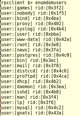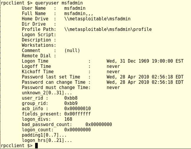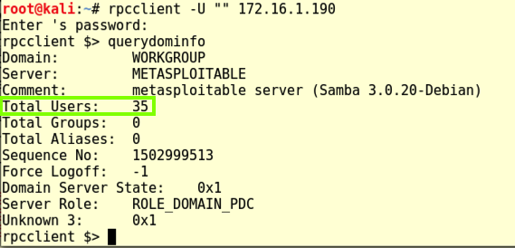 This displays an "rpcclient $>" prompt. Execute this command: