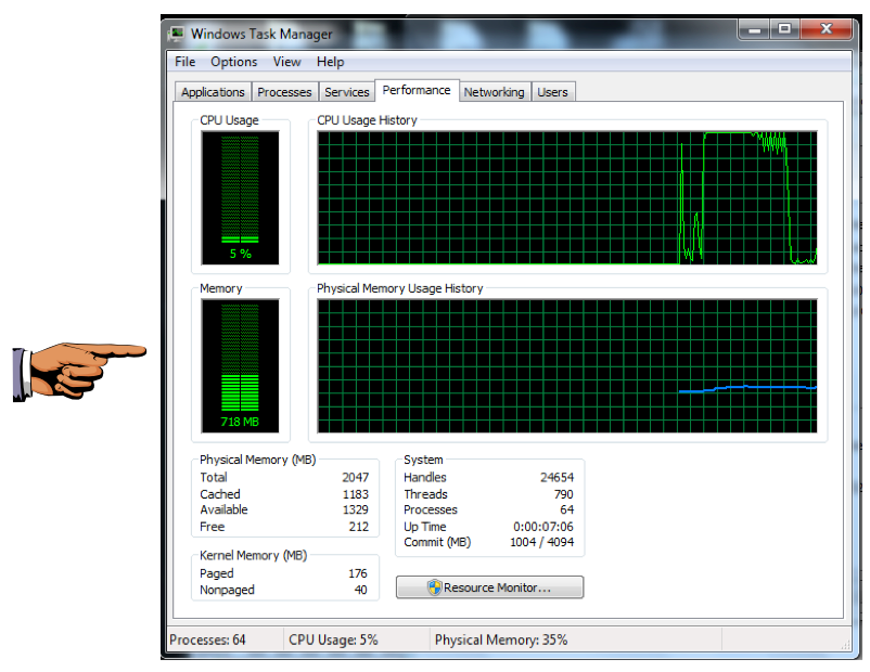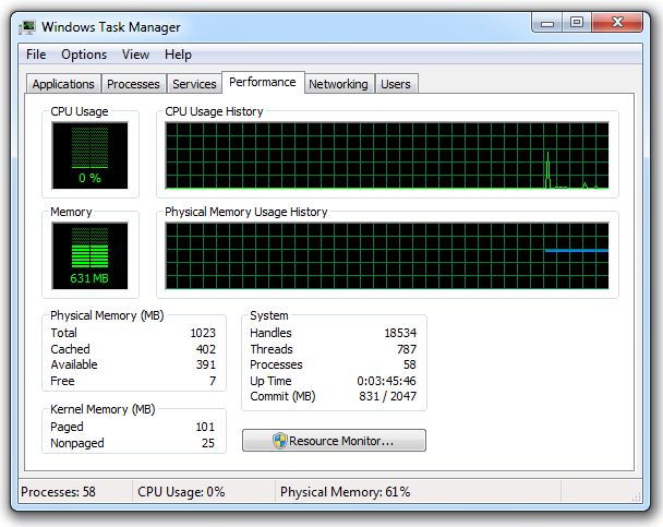 Click the Performance tab. You should see 0% CPU usage, or close to it, as shown below: