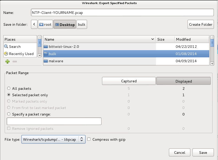 In the "Wireshark: Export Specified Packets" box, at the top, enter a name of "NTP-Client-YOURNAME.pcap".