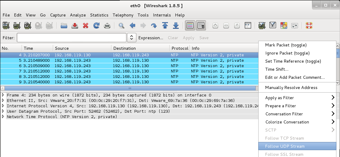 Right-click one of the NTP packets and click "Follow UDP Stream", as shown below.