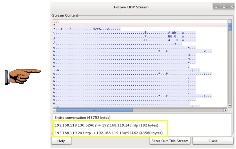 In the "Follow UDP Stream" box, at the bottom, click the double-arrow to the right of the "Entire conversation" message.