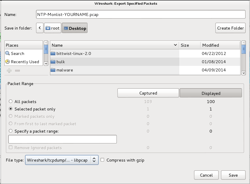In the "Wireshark: Export Specified Packets" box, at the top, enter a name of "NTP-Monlist-YOURNAME.pcap".