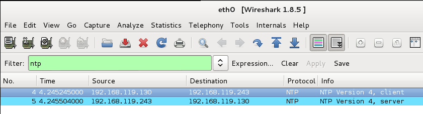 In Wireshark, in the top pane, make sure the first UDP packet is highlighted, the one sent to your NTP server, as shown below.
