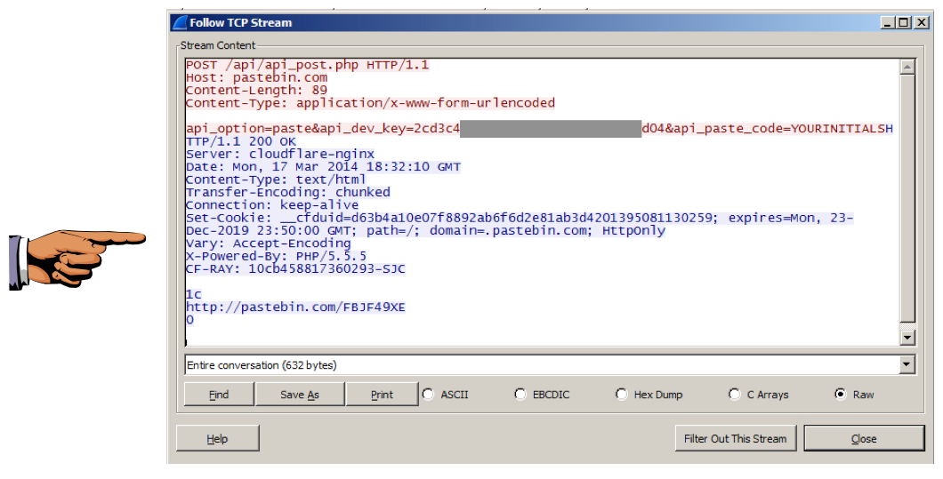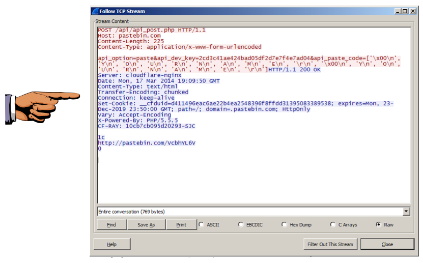 A Wireshark capture of the TCP stream showing that it worked, and returned a URL to the pastebin post: