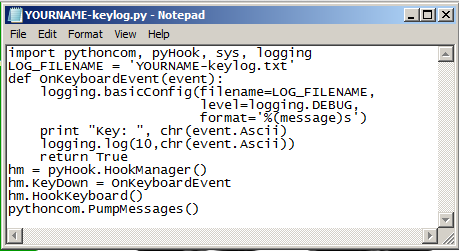 Save it as YOURNAME-keylog.py on your Desktop. When saving, use "Save as type" of "All Files" to prevent Notepad from adding a ".txt" file extension.