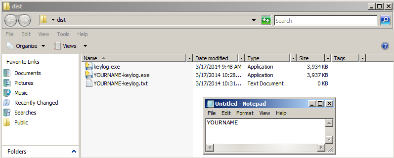 A file named "YOURNAME-keylog.txt" appears in the Dist folder, as shown below.