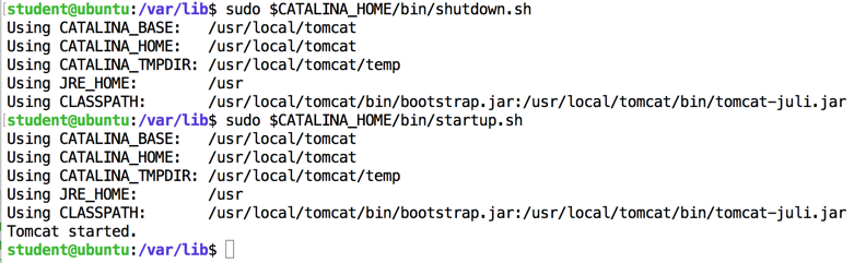 In the SSH session controlling your Ubuntu server, execute these commands to restart Tomcat. It may take a few minutes to shut down the first time--that's OK.