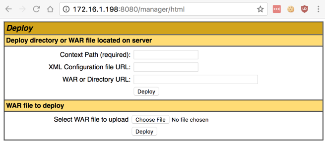 In the "Tomcat Web Application Manager" page, scroll down to the "Deploy" section, as shown below.