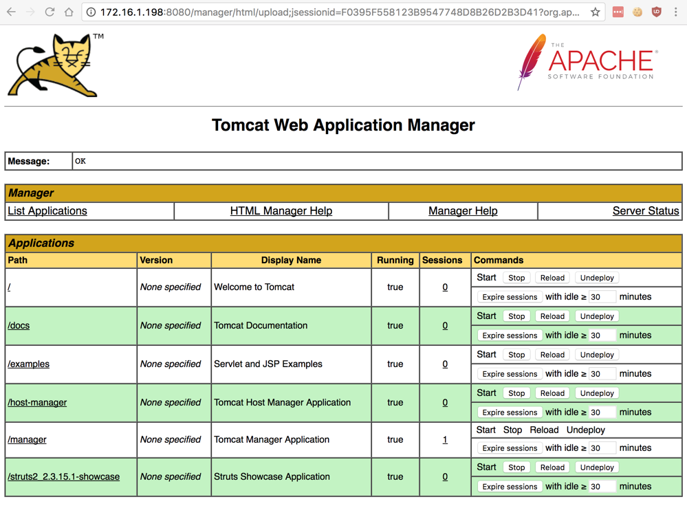 The Tomcat page now shows the /struts2_2.3.15.1-showcase application at the bottom of the Applications section, as shown below.