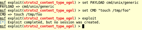 In Metasploit, execute these commands to set CMD to "touch /tmp/foo" and exploit the target: