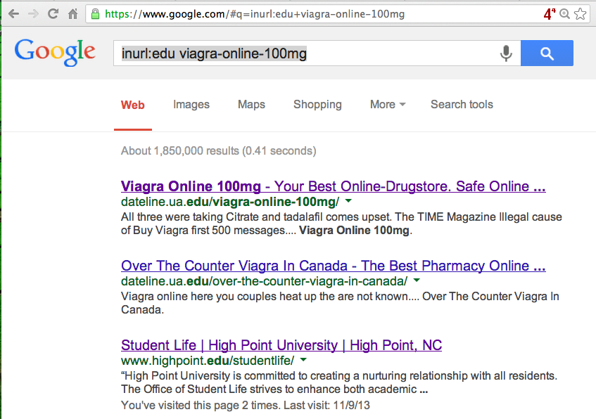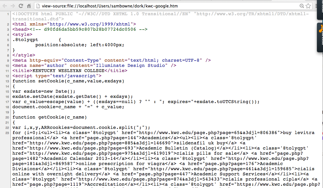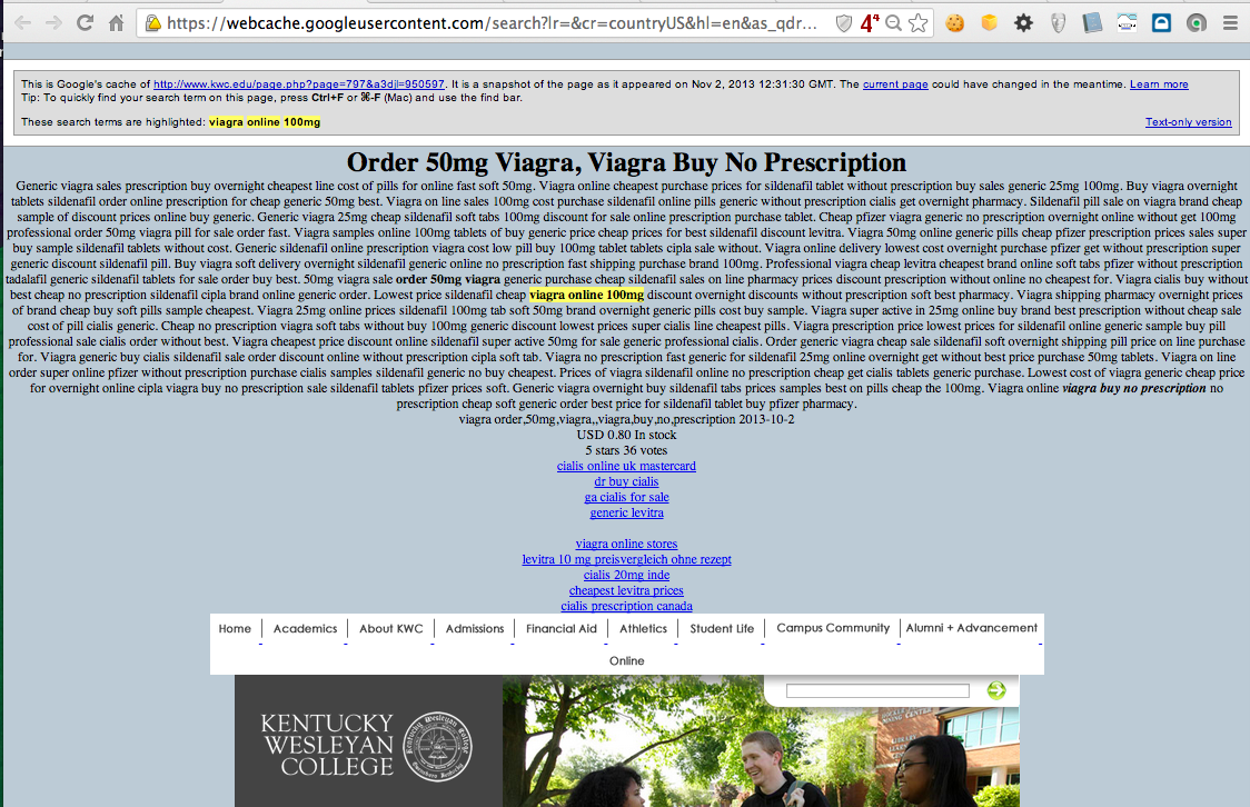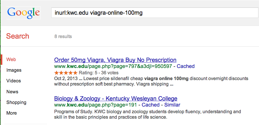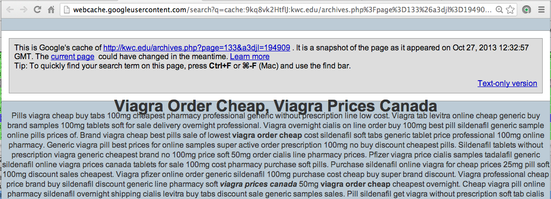 To see the infection, simply google "inurl:kwc.edu viagra-online-100mg" (without the quotation marks) and click any link. I recommend using a Mac or Linux machine to perform this test because the pages that open contain malware.