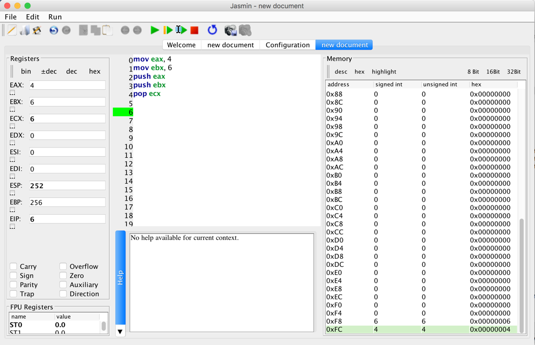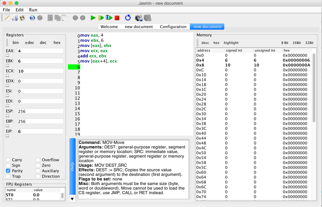 Move the value 4 into eax mov ebx, 6