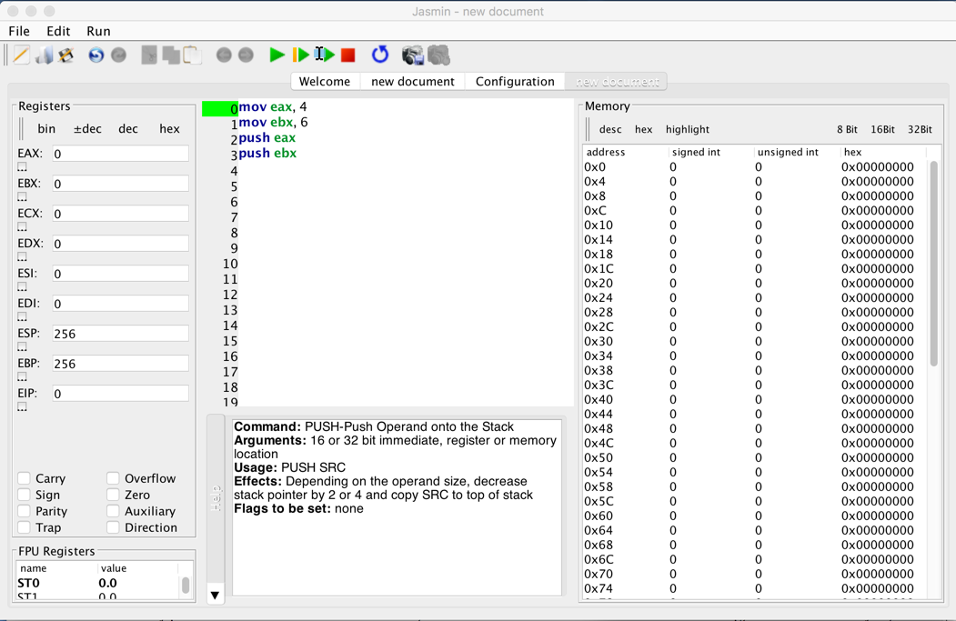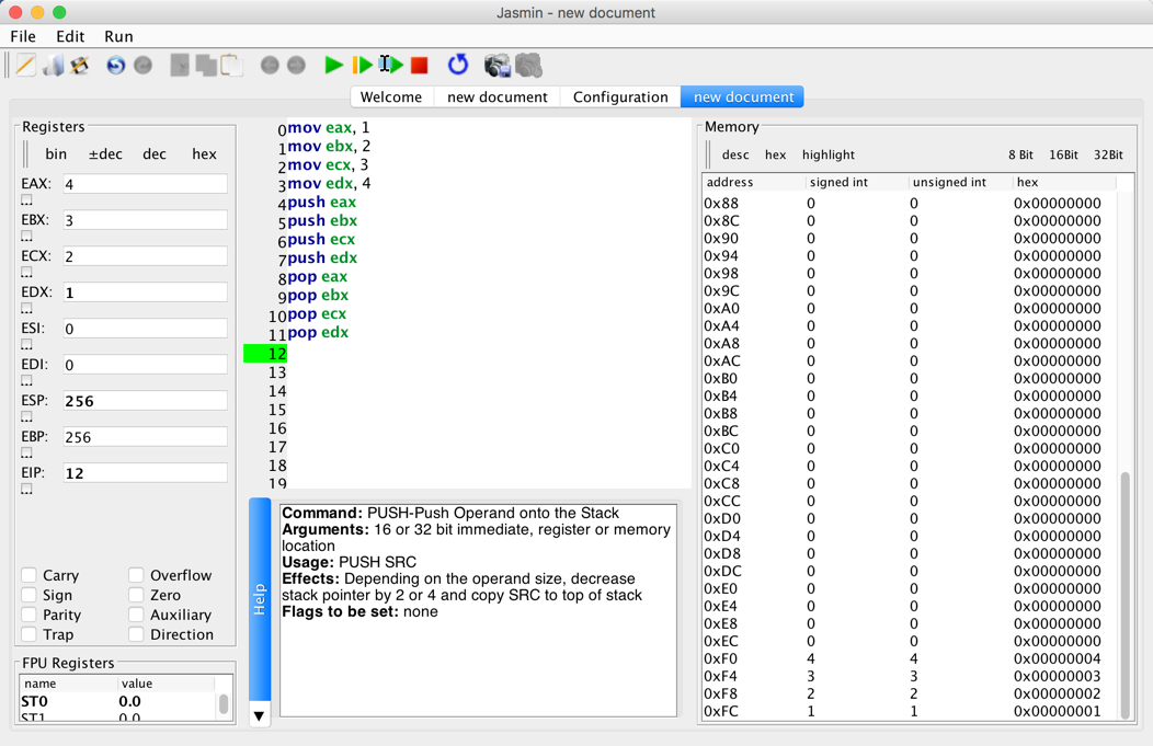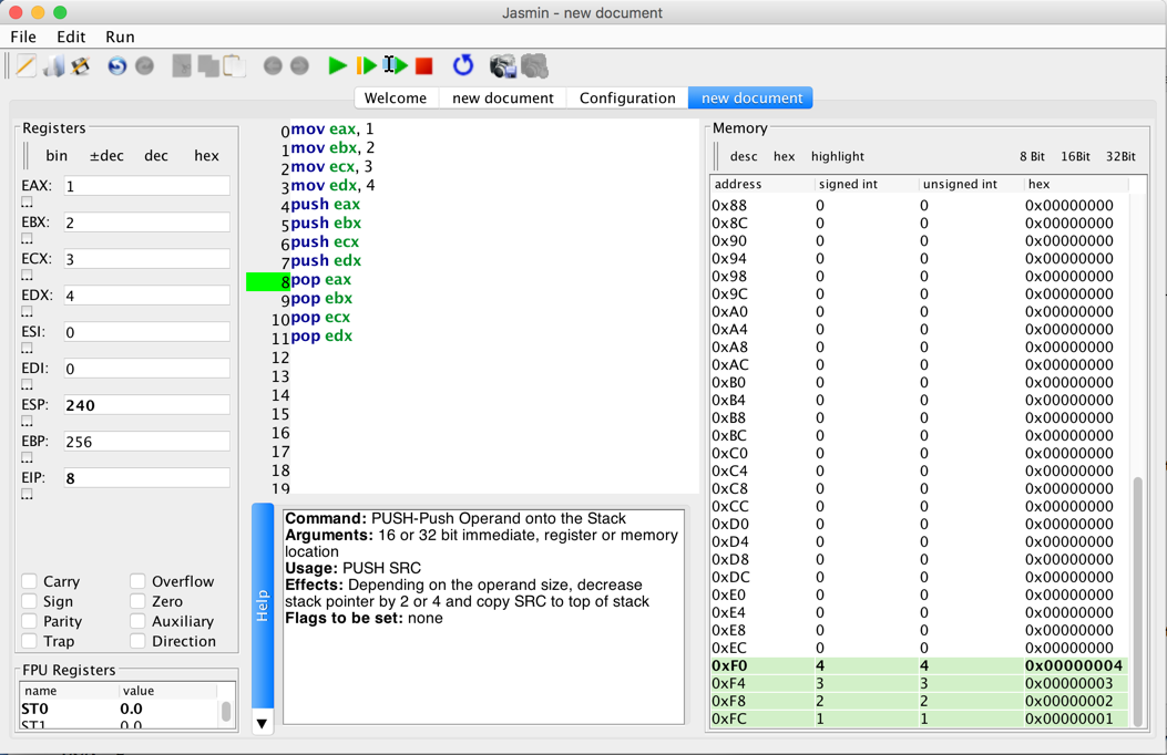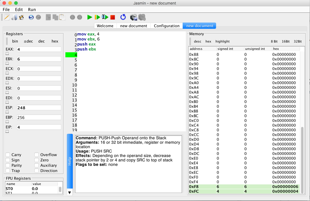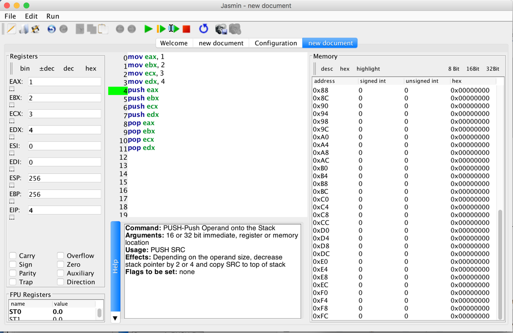 Push the Step four times to execute only the first four instructions, as shown below: