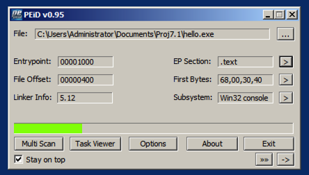 The lower left of PEiD shows the detected language used to create the program, which is covered by a green box in the image below.