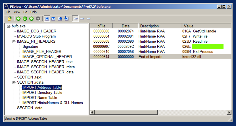 In the left pane of PEiD, expand the "SECTION .rdata" container and click "IMPORT Address Table", as shown below.