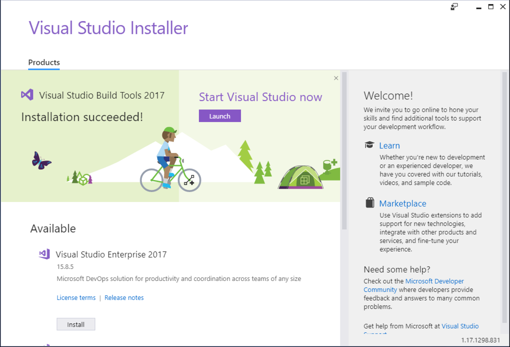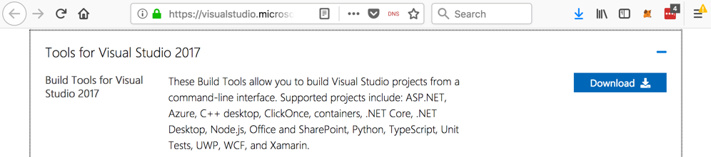 On the next page, in the "Build Tools for Visual Studio 2017" section, click the Download button, as shown below.