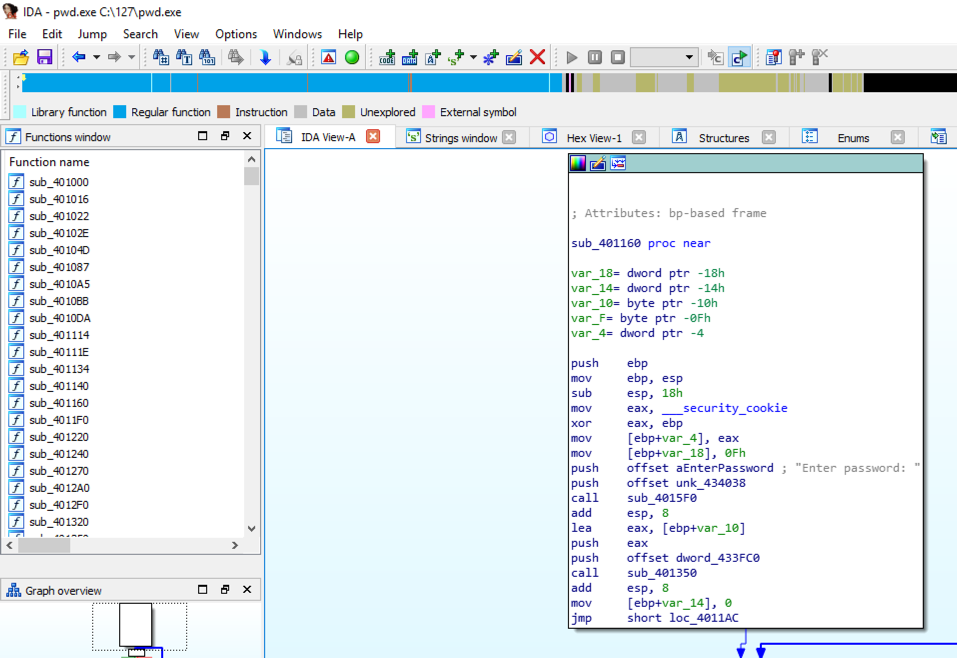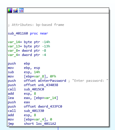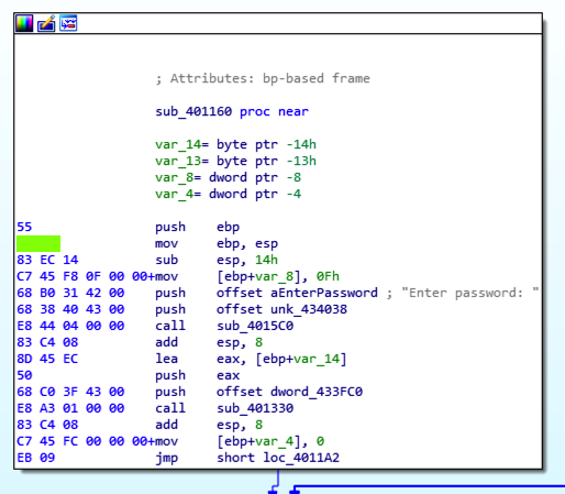 The .rdata section appears, showing stored strings. On the line containing "Enter password", find "DATA XREF". Point to the address after the "DATA XREF" marker, as highlighted in yellow in the image below, and double-click it.