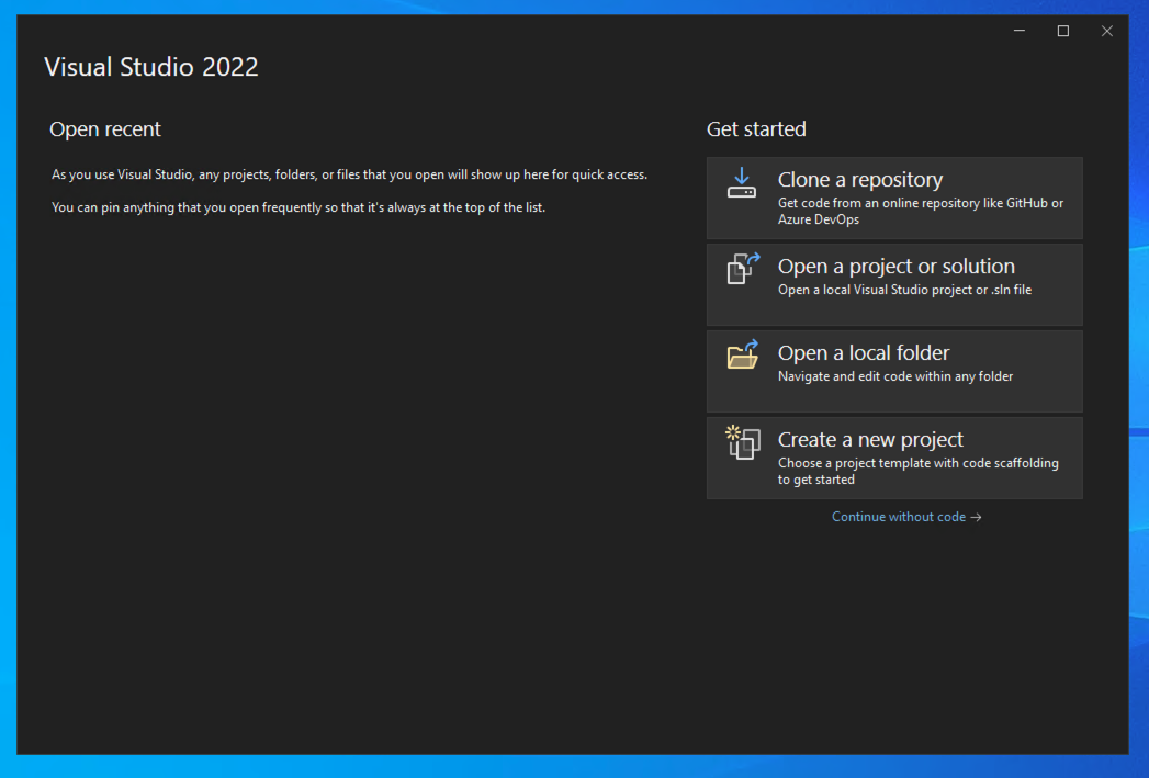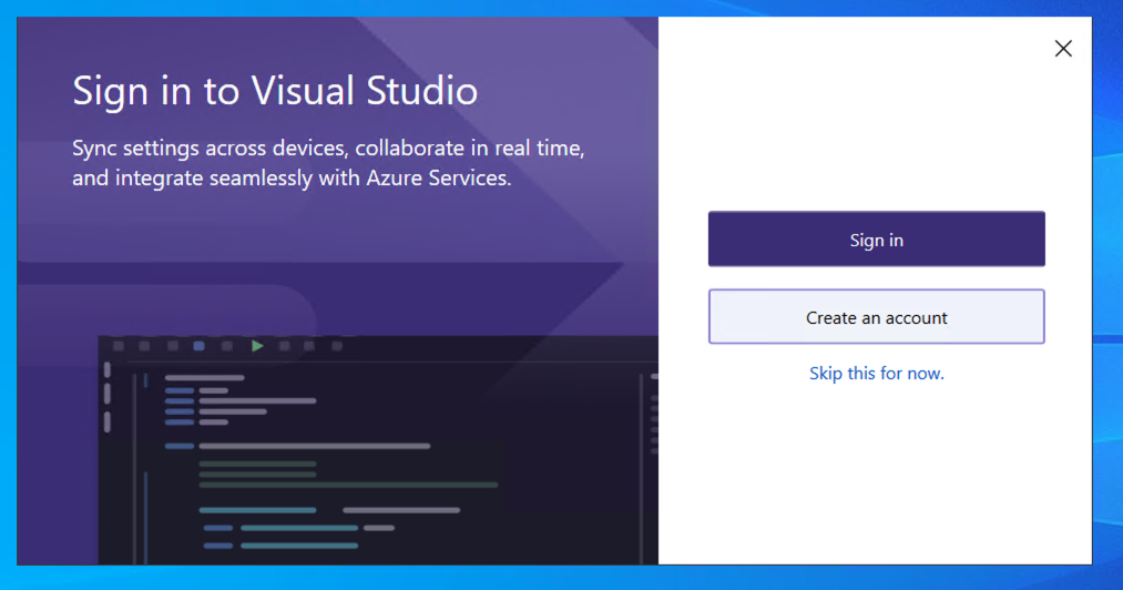 At the "Sign in to Visual Studio" box, click "Skip this...", as shown below.