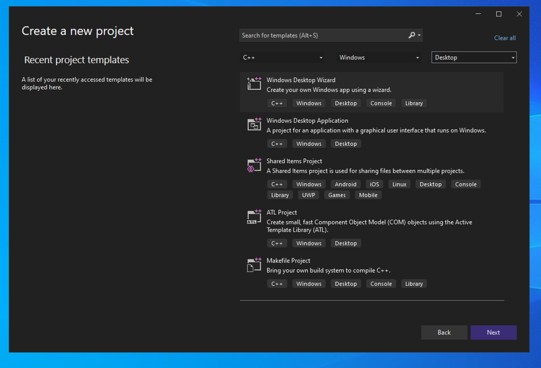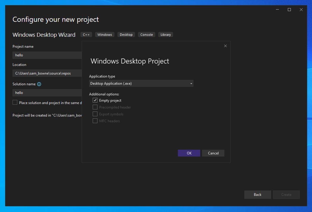 In the "Windows Desktop Project" box, make these selections, as shown below.