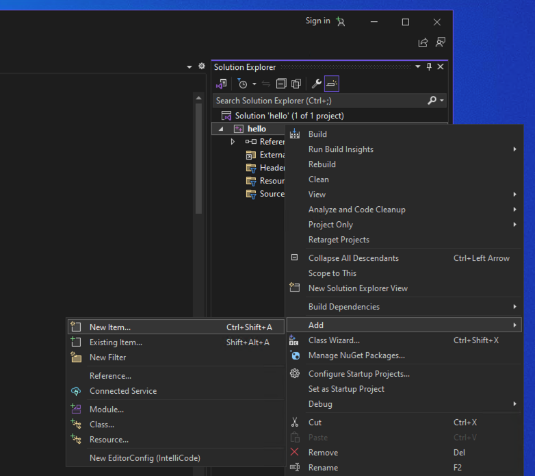 In the "Solution Explorer" pane, right-click hello and click Add, "New Item", as shown below.