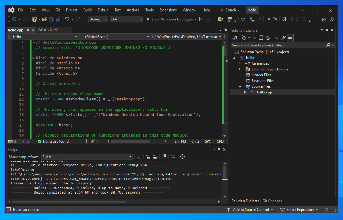 From the menu, click Debug, "Start Debugging".After a few seconds, a box appears with a message saying saying "Hello, Windows desktop!", as shown below.