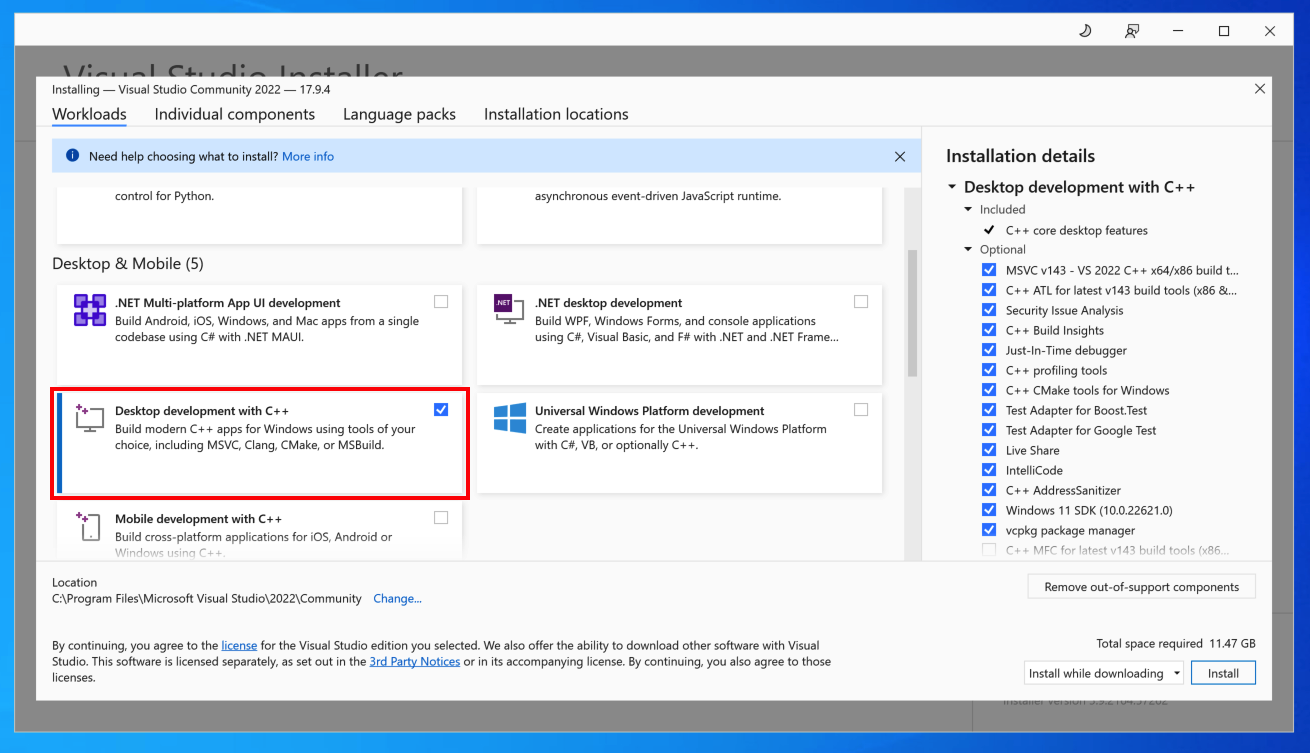 When the large "Installing" window appears, scroll down a bit and check "Desktop development with C++", as shown below.