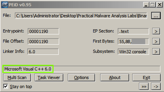 Analyze the unpacked file with PEiD. It now is regognized as a "Microsoft Visual C++ 6.0" file, as shown below.