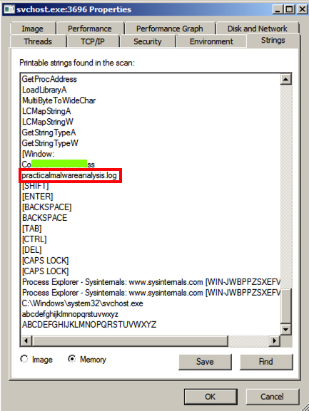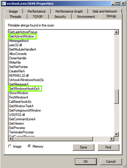 At the bottom of the box, click the Memory button. Now the strings are completely different, and contain these suspicious items: GetActiveWindow and SetWindowsHookExA.