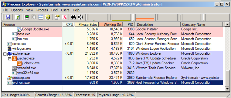 After a second or two, the Lab03-03.exe process terminates, leaving the svchost.exe running as an orphan process, as shown below.