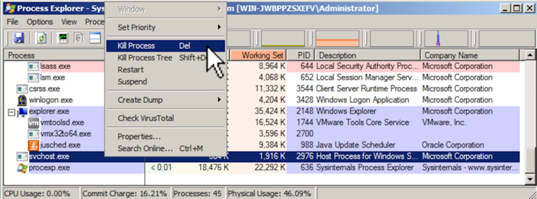 To see that, in Process Explorer, right-click svchost.exe and click Properties.