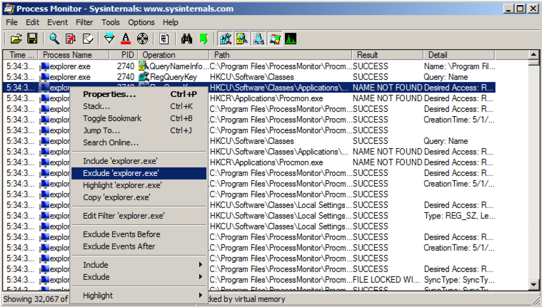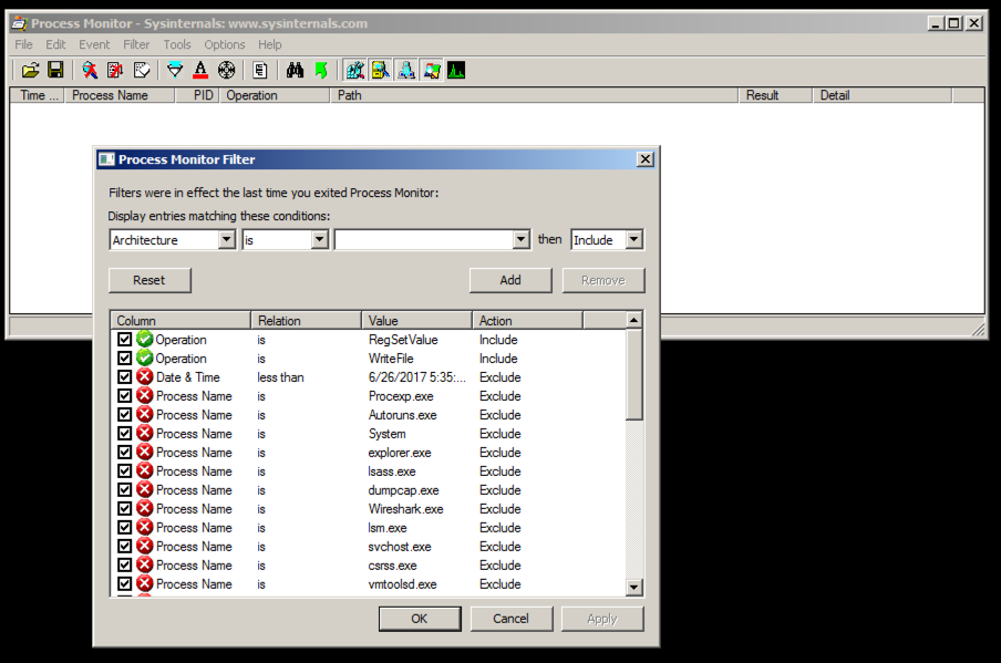 You don't need to do this on the VM I gave you, but if you are using Process Monitor on some other system, here's how you exclude processes.