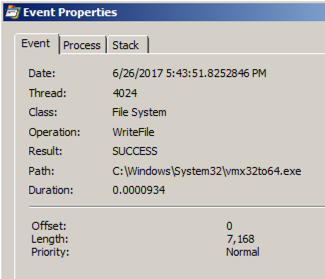 Double-click the event with a Path ending in vmx32to64.exe. The Properties sheet shows that this event creates a file named vmx32to64.exe, as shown below.