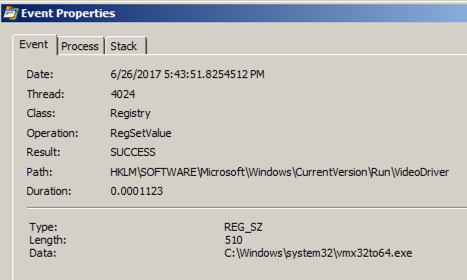 This event creates a new a Run key in the registry named "VideoDriver" with a value of "C:\WINDOWS\system32\vmx32to64.exe" -- this is a persistence mechanism, to re-launch the malware when the machine restarts.