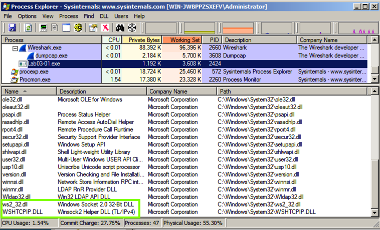 In Process Explorer, in the top pane, find Lab03-01.exe and click it.
