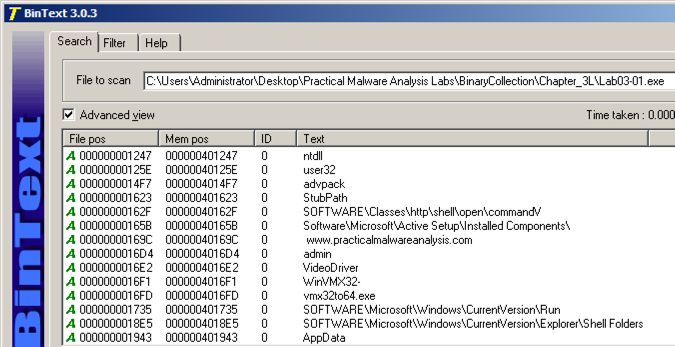 Examine the strings in Lab03-01.exe and find these items, as shown below. These readable strings are surprising--if the malware were packed, the strings would not be readable. Something strange is going on, and the easiest way to learn more is dynamic analysis.
