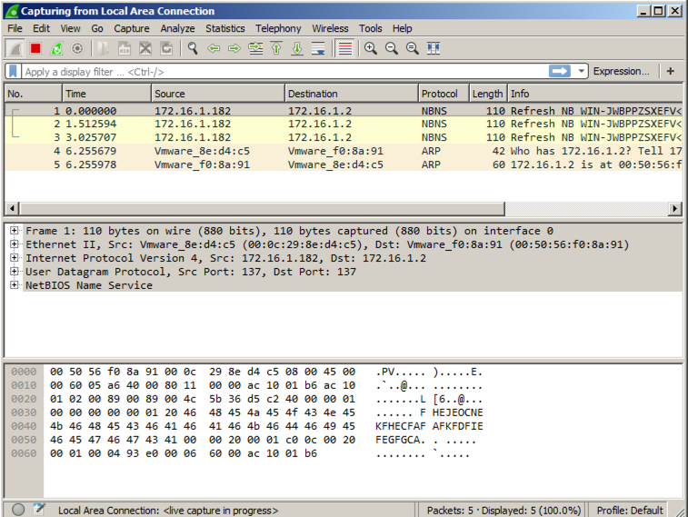 Start Wireshark and begin capturing packets from the interface that goes to the Internet, which is normally "Local Area Connection".