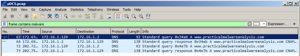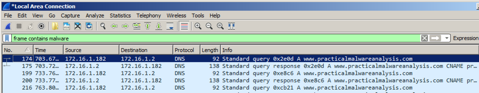 Click the line showing the first DNS request for www.practicalmalwareanalysis.com -- in the example above, it is packet 174.