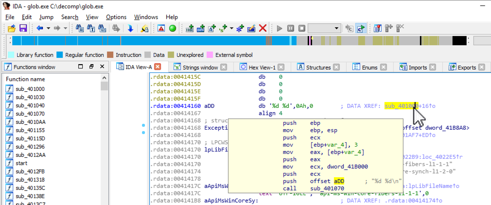 The address in the rdata section where that string is stored appears, as shown below. On the right side, point to the address labelled "DATA XREF". The code that uses this string appears in a pop-up box, as shown below.
