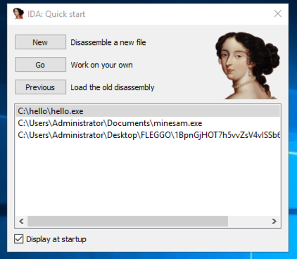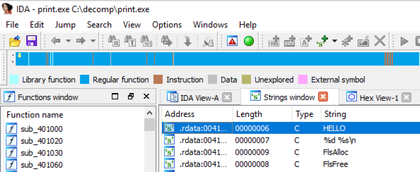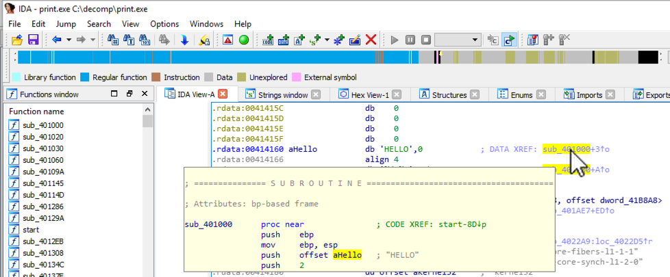 From the IDA manu bar, click View, "Open subviews", Strings. In the Strings pane, double-click HELLO, as shown below.