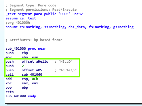 Double-click the address labelled "DATA XREF". The assembly code appears, as shown below. Notice these features:
