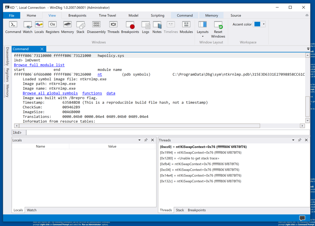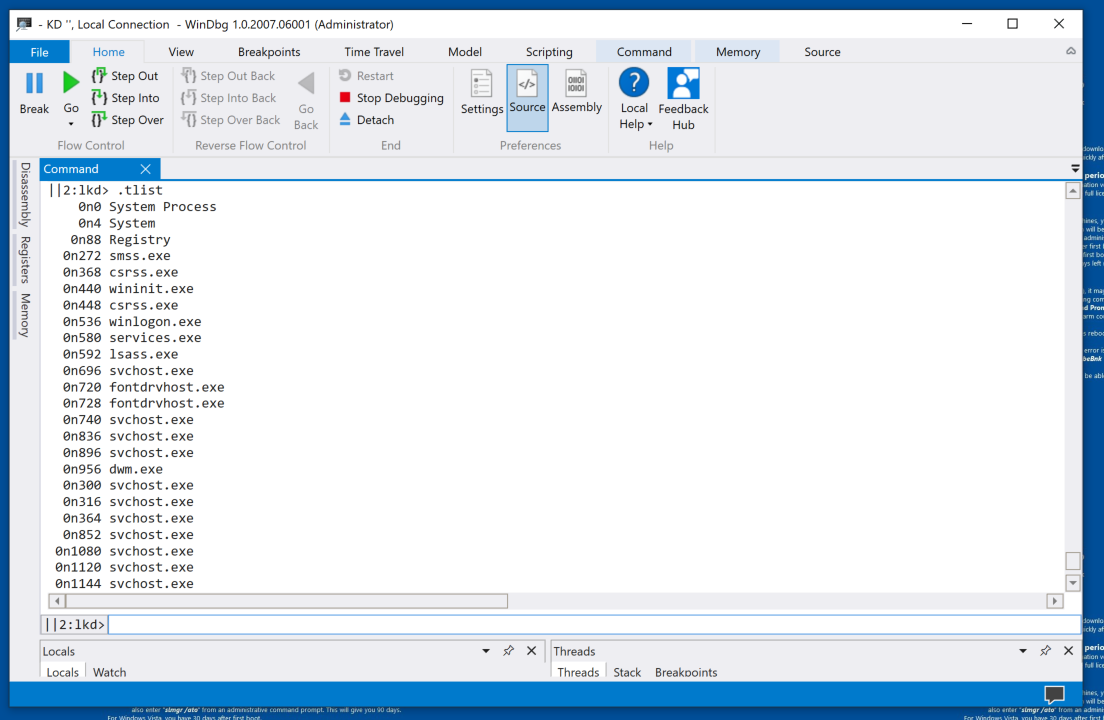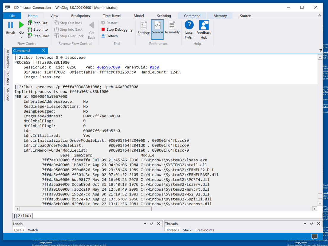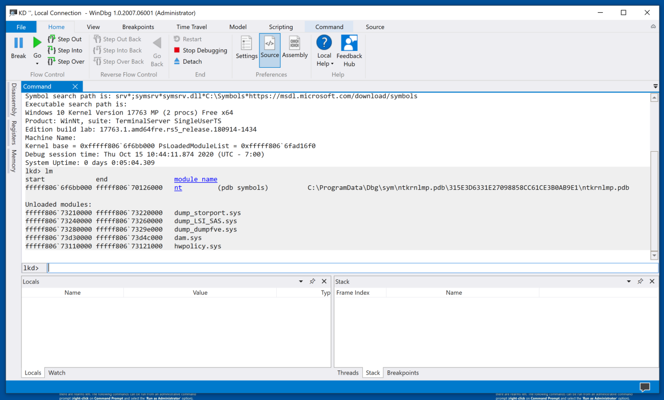 If the command bar in the lower center of WinDbg shows "BUSY", wait for it to finish. When I did it using Windows 11 on April 22, 2024, it took about five minutes to respond.