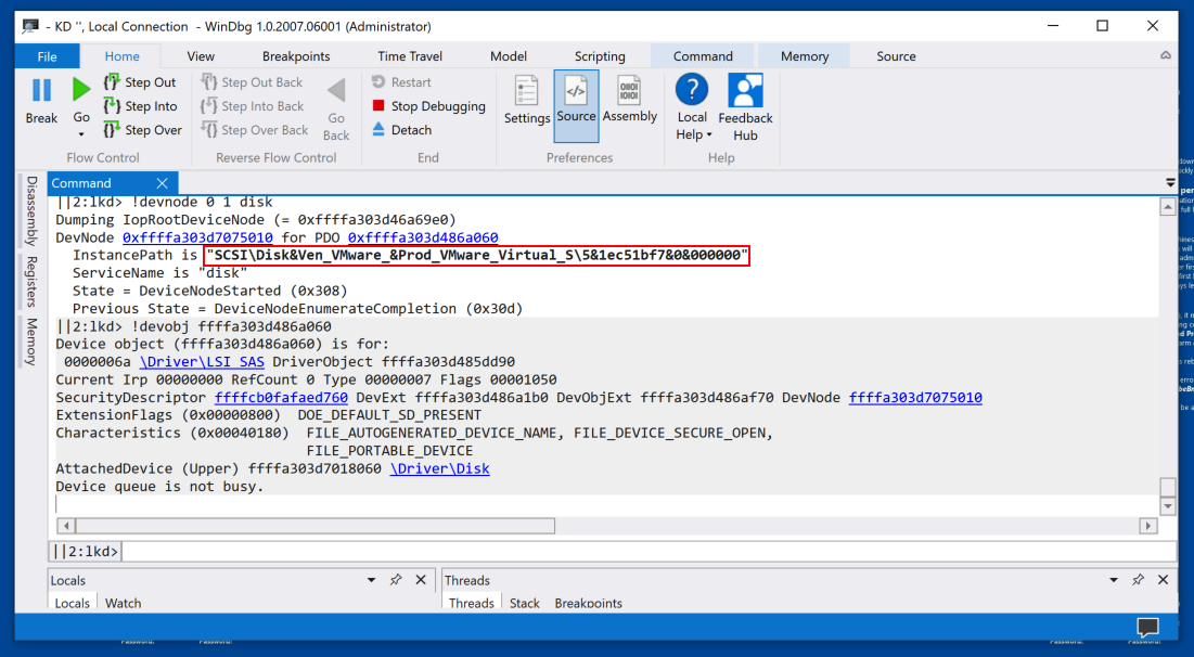 Click that blue address for more information, including the InstancePath, which shows that I am using a VMware disk, as shown below.