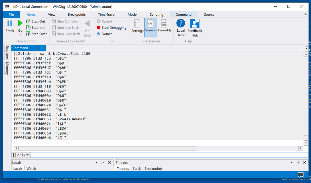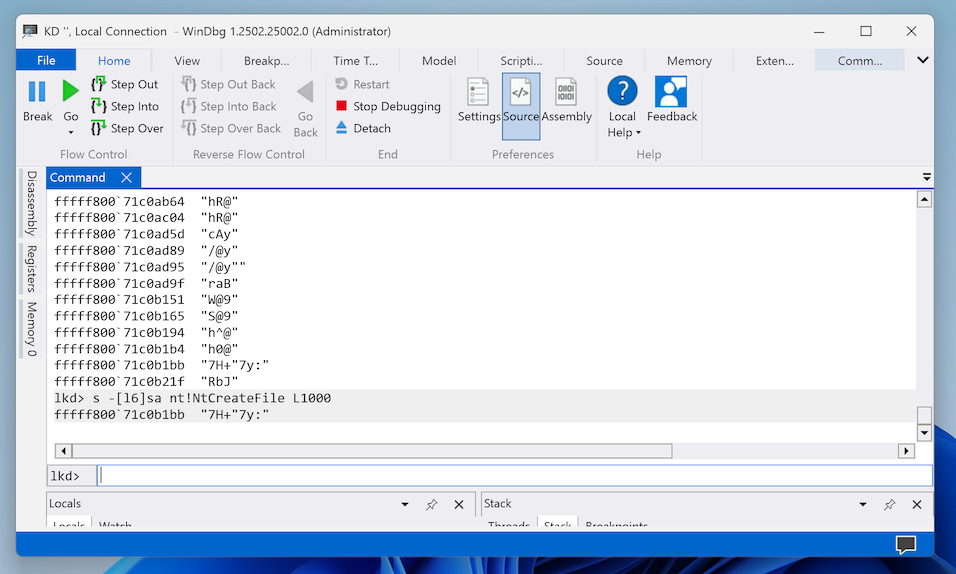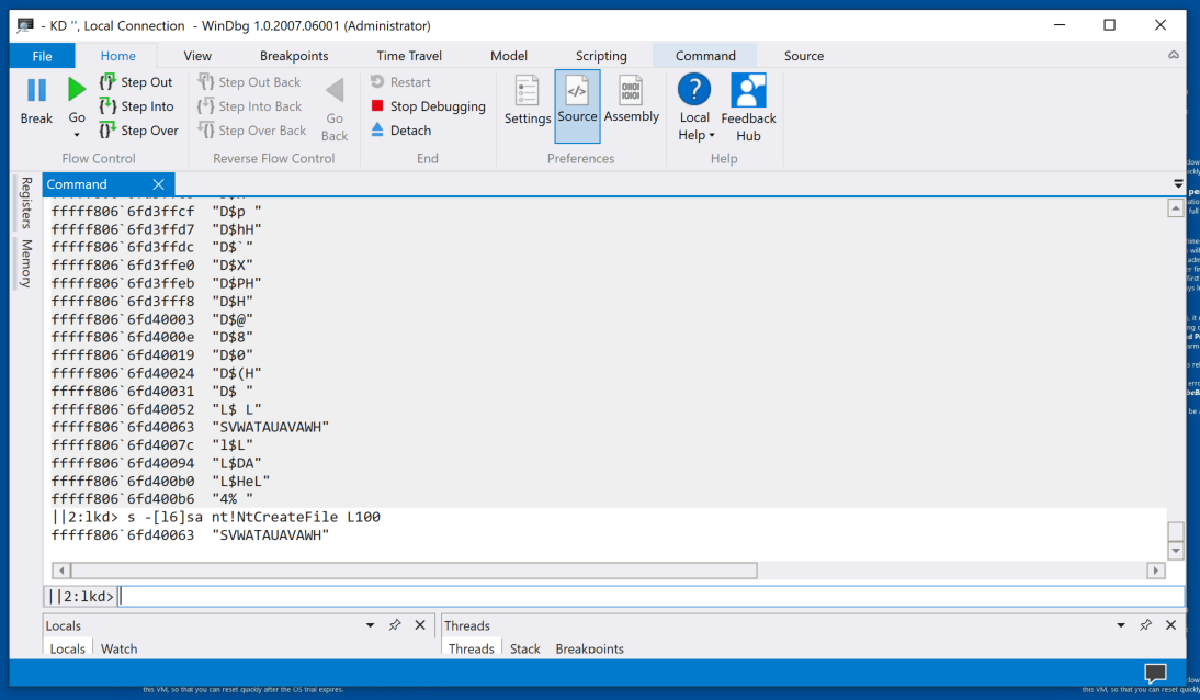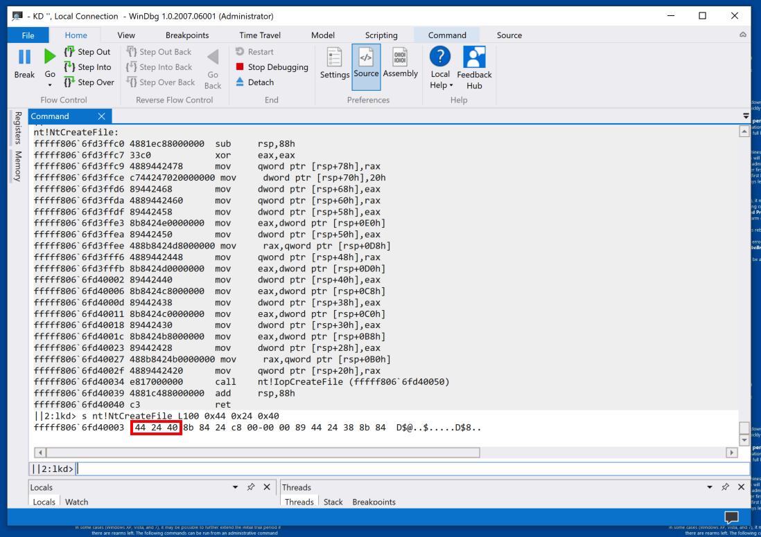 s nt!NtCreateFile L100 0x03 0x01 0x91Note: the order of the bytes within a command must be reversed to search for them.